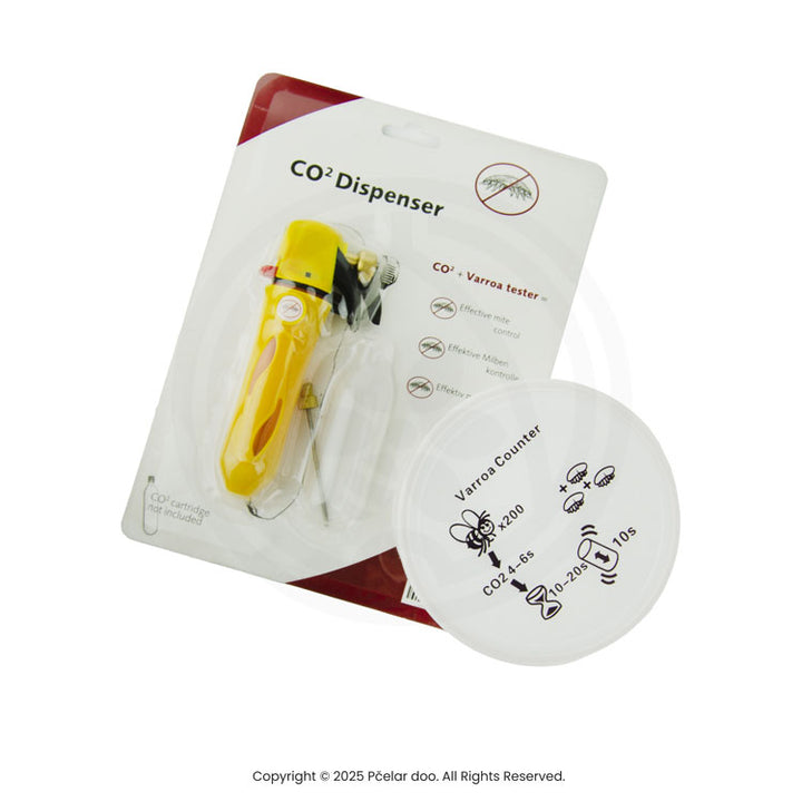 Oprema za testiranje prisustva varooe na pčelama, na jednostaven, brz i efikasan način. U paketu se dobija posuda i aplikator CO2 sa iglom. Partone sa gasom nisu ukljucene u cenu.